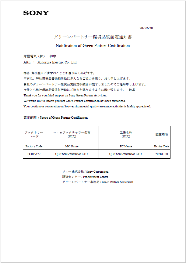 通寶半導體已獲得索尼公司的綠色合作夥伴認證。